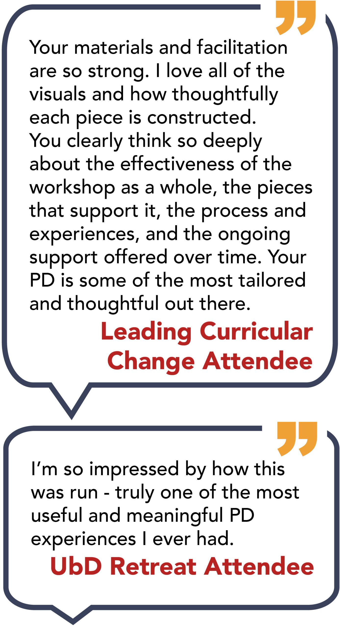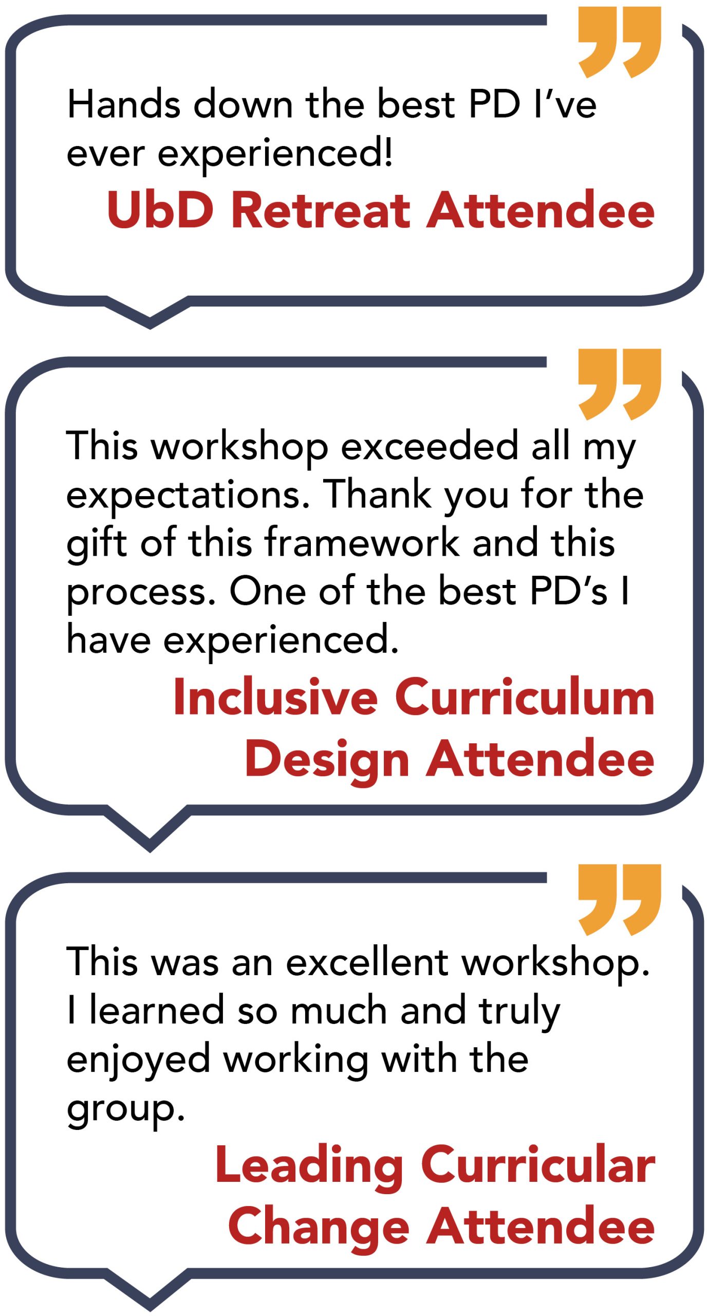 Our Advanced UbD for Curriculum Leaders and Inclusive Curriculum Design both offer teachers and school leaders high-quality, small group settings to expand their thinking about best practices for creating, evolving, and implementing transformative curriculum. All our offerings are guided by our PD the way PD should be philosophy that equips and empowers attendees to immediately apply what theyâve learned while fostering meaningful collaboration.
